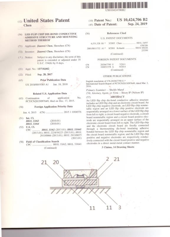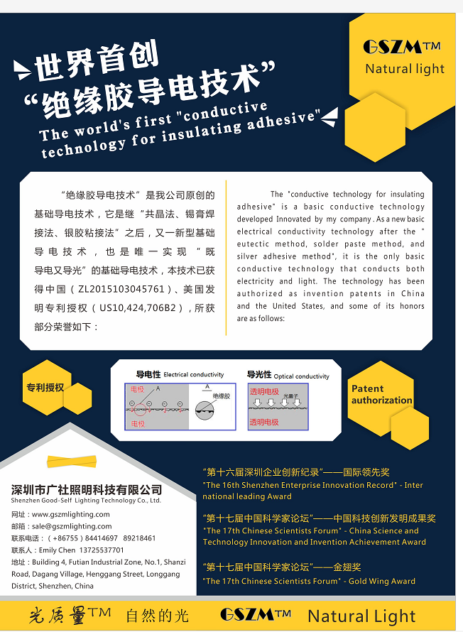 The "conductive technology for insulating adhesive" is a basic conductive technology developed Innovated by my company. As a new basic electrical conductivity technology after the "eutectic method, solder paste method, and silver adhesive method", it is the only basic conductive technology that conducts both electricity and light. The technology has been authorized as invention patents in China and the United States.
